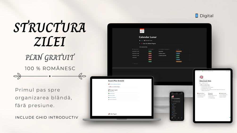 O mică previzualizare din planul complet care te ajută să-ți organizezi ziua cu mai mult calm și claritate. Ideal dacă vrei să testezi stilul, să vezi cum funcționează Notion și să simți dacă ți se potrivește vibe-ul 🌿